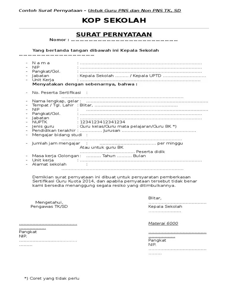 Karena suatu surat pernyataan ini bersifat remi maka beberapa hal yang harus di lengkao dalam membuatannya, seperti kop surat. Salah satu impian guru adalah menerima tunjangan sertifikasi. Pernyataan tertulis dari kepala sekolah bisa untuk guru ataupun siswa. Surat pernyatan dari kepala sekolah biasanya dikeluarkan untuk guru yang menerima tunjangan sertifikasi. Biasanya, jenis surat pernyataan ini tergantung dari si pembuat ingin surat pernyataan dibuat dengan berdasarkan fakta yang berlaku di lapangan.